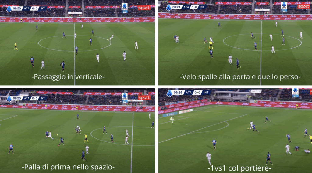 Qui la chiave di volta è rappresentata dai due trequartisti, i due ricettori posti nei canali centrali e deputati alla risoluzione delle trame più difficili tramite controlli nello stretto, inserimenti, assist, dribbling e tiri da fuori. Quattro archetipi di giocatori fioriscono in questo contesto di ruolo, la seconda punta inventiva (Muriel, Ilicic, Lookman…) il regista avanzato (Koopmeiners, Malinovsky…) la seconda punta associativa (De Ketelaere, Gomez…) e l’incursore (Cristante, Pasalic…).